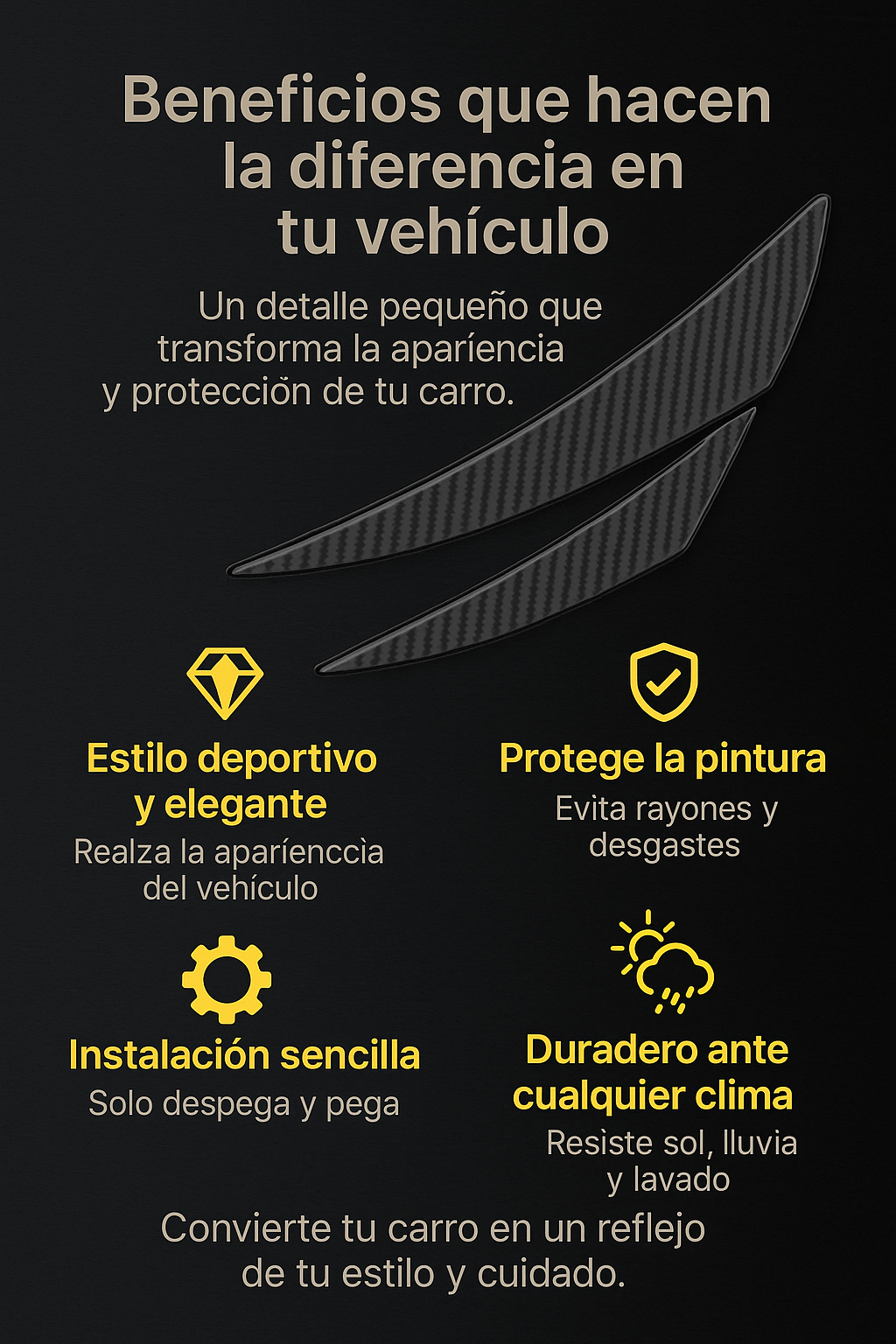 Este producto no solo de la estilo a tu coche, además el da protección a tu bomper para evitar rayones o golpes que te podrían costar un buen dinero